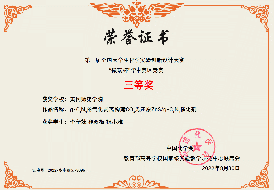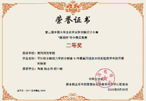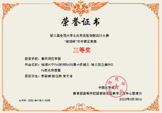 在此次全国老员工化学实验创新设计竞赛华中赛区中,威廉希尔体育参赛教师和员工共同努力,经过初赛,在73所高校172支参赛队伍中脱颖而出,由张龑、杨一思老师指导,陶茜、陈志伟、胡小敏同学组成的代表队,进入复赛,经过作品展示和现场答辩,获得华中赛区二等奖。陈建、张燕老师指导,李辛妹、程双梅、祝小雅同学组成的代表队,陈砚美老师指导,郭慧娴、陈佳燃、黄文涛同学组成的代表队,分别获得华中赛区三等奖。