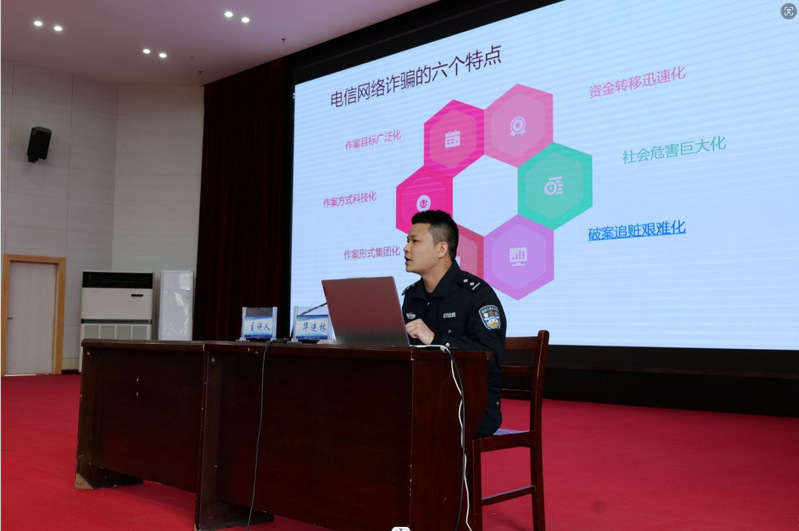 讲座中,华进林队长以“无诈校园、反诈有我”为主题,从电信网络诈骗的定义和特点、常见的诈骗手法及防范措施、谨防成为电信网络诈骗的帮凶三个方面详细宣讲。他指出,当前电信网络诈骗呈现作案目标广泛化、作案方式信息化、作案形式集团化、作案资金转移迅速化、作案社会危害巨大化、破案追赃艰难化的六大特点。并并结合本地典型案例以公司师生角度出发,介绍涉校电信网络诈骗的特征、惯用伎俩及识别新型电信网络诈骗的方法,还对在校师生容易被骗的原因进行了深入分析,并提供了行之有效的防范及补救建议,提醒大家切勿贪图小恩小惠,要提高自身防范意识,避免不必要的经济损失和防止违法犯罪。华进林队长以案示警、以案示法,在座师生全神贯注、仔细聆听,感觉深受教育。